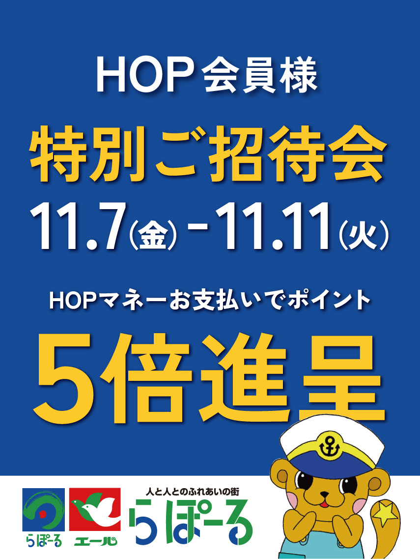 上記期間中らぽーる専門店および、エール衣料・住居関連限定でHOPカードポイント5倍進呈いたします。 お得なこの期間中にぜひお買い物くださいね!