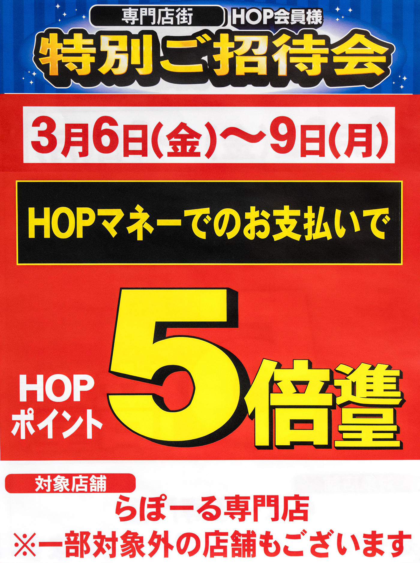 HOP会員様『特別ご招待会』3月6日(金)〜9日(月)の4日間はHOPマネーのお支払でポイント5倍!