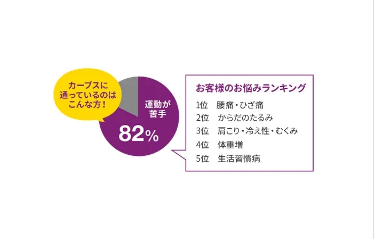 カーブスの30分のサーキットトレーニングは、運動がはじめてな人も、今まで運動が長続きしなかった人も、体を動かすのが好きになる画期的なプログラム。
